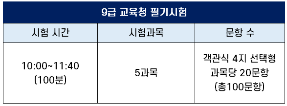 5과목을 시험 보는 지방교육청 9급 공무원 필기시험 시간은 오전 10시부터 11시 40분까지 100분입니다.
