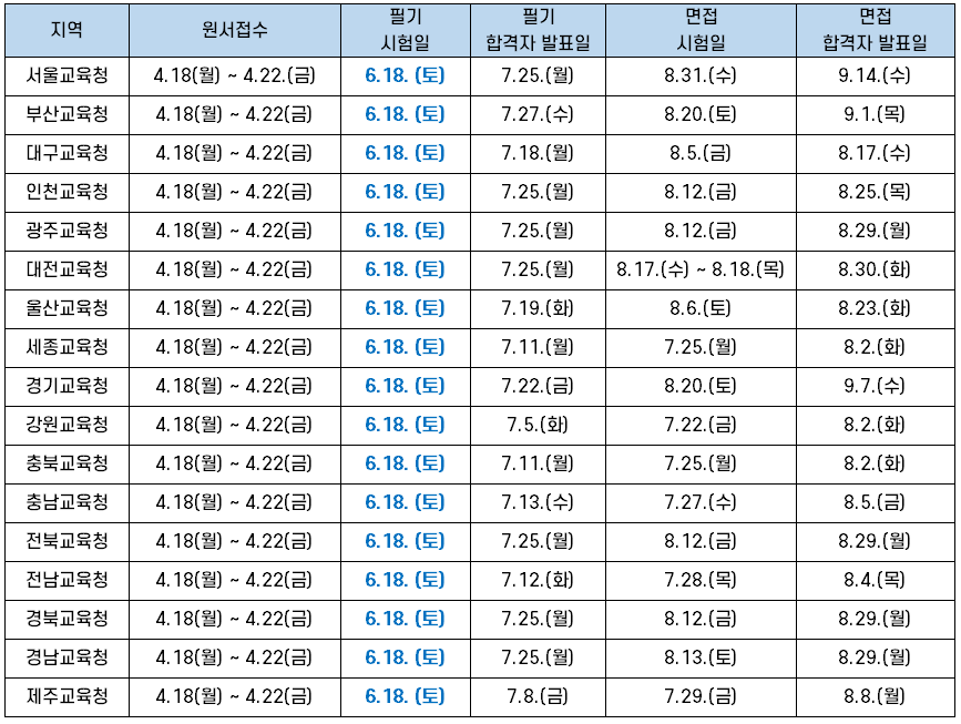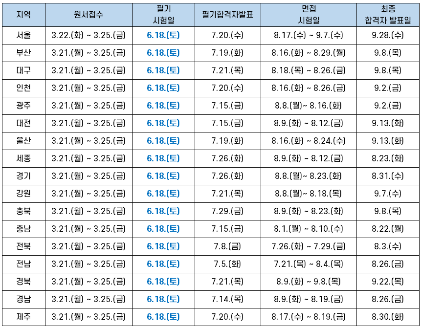 서울시, 부산시, 대구시, 인천시, 광주시, 대전시, 울산시, 세종시, 경기도, 강원도, 충청북도, 충청남도, 전라북도, 전라남도, 경상북도, 경상남도의 17개 시도에서 동시에 원서접수를 진행하고 같은 날 필기시험을 보는데요. 필기시험 합격자 발표일, 면접시험일, 최종 합격자 발표일은 아래 표와 같이 시도별로 시험 일정이 다릅니다.