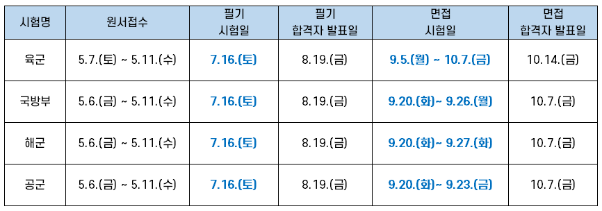 군무원 9급 공채 시험은 매년 7월 중에 시행되는데요. 2022년 필기 시험은 7월 16일(토)에 시행됩니다. 국방부, 육군, 공군, 해군(해병대 포함) 군무원 필기시험일과 합격자 발표는 동일하지만 나머지 일정은 아래 표와 같이 조금씩 다릅니다.
