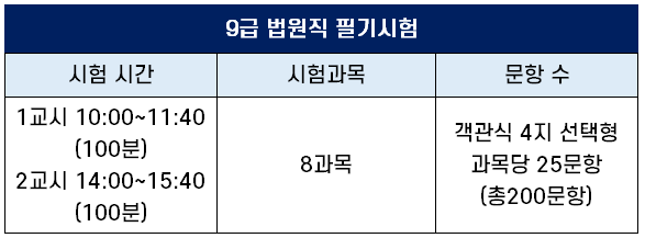 8과목을 시험 보는 법원직 9급 공무원 필기시험은 1교시와 2교시로 나누어 시행되며, 교시마다 시험 시간은 100분으로 총 시험 시간은 200분입니다.