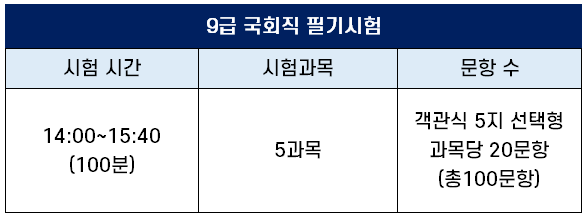 5과목을 시험 보는 국회직 9급 공무원 필기시험 시간은 오후 2시부터 3시 40분까지 100분입니다.