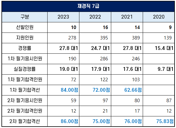 2020년부터 2023년까지 시행된 7급 재경직 공채 시험의 경쟁률과 합격선을 아래 표로 정리했습니다.