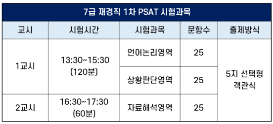 7급 재경직 1차 PSAT 시험은 언어논리영역, 자료해석영역, 상황판단영역에서 각 25문항이 출제되고, 영역마다 1시간의 시험 시간이 주어지는데요. 시험 시간표는 다음과 같이ㅣ 1교시에 언어논리영역과 상황판단영역을 같이 시험보고, 2교시에 자료해석영역을 봅니다.