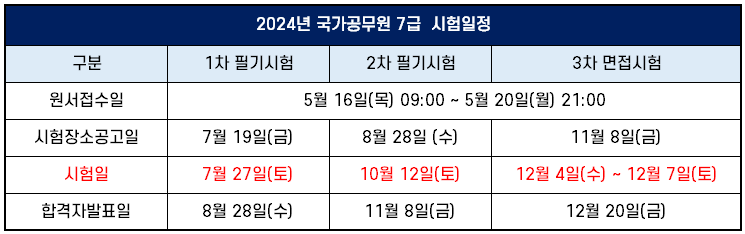 7급 재경직 시험은 국가직 7급 공개경쟁채용 시험 일정에 따라 실시되는데요. 2024년 시험 일정은 아래 표와 같이 1차 PSAT은 7월 27일 토요일에, 2차 필기시험은 10월 12일 토요일에 실시됩니다.