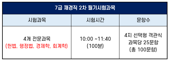 7급 재경직 2차 필기시험 과목은 헌법, 행정법, 경제학, 회계학 4과목으로 과목마다 객관식 4지 선택형 25문제가 출제되어 총 100문제를 100분동안 풀게 됩니다.