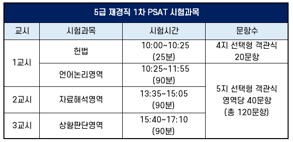 참고로 5급 재경직 PSAT은 영역당 40문항이 출제되어 시험시간도 90분으로 늘어납니다. 또한 5급 재경직은 헌법 과목이 1차 시험과목에 포함되어 2차 시험 과목으로 치르는 7급 재경직과 차이가 있습니다.