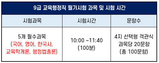 | 9급 교육행정직 | 국어, 영어, 한국사, 교육학개론, 행정법총론 |