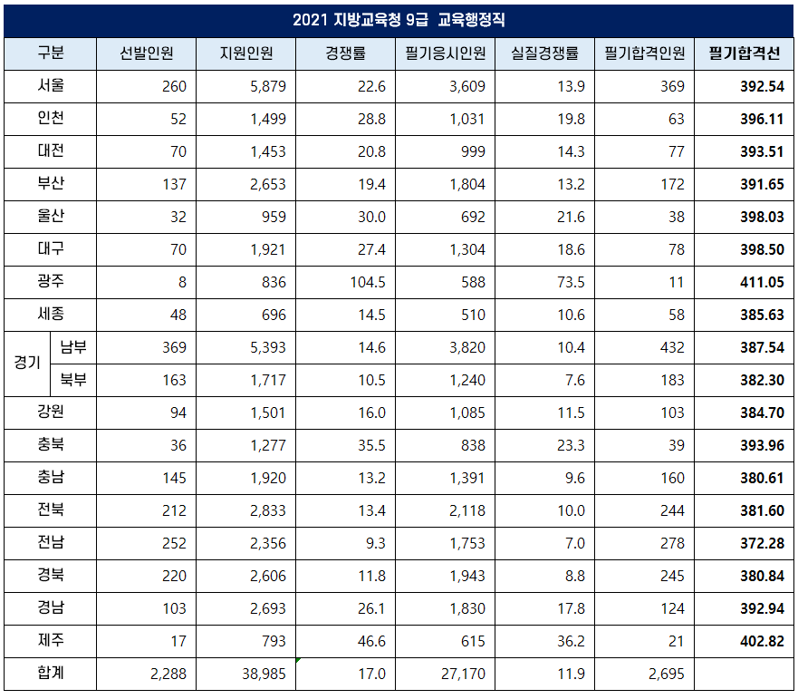 2021년 17개 시도 교육청에서 선발한 9급 교육행정직은 총 2,288명이었고, 평균 경쟁률은 17대 1을 기록했습니다.