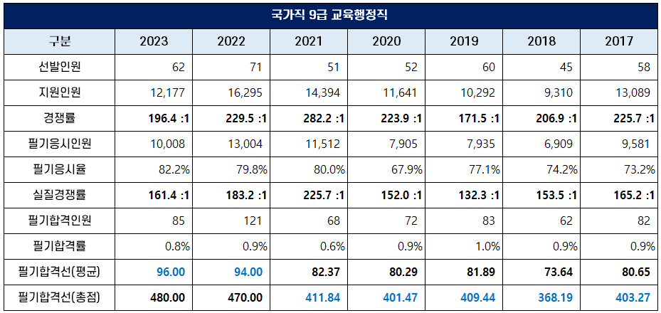 2023년 교육행정직 공무원 경쟁률 및 합격선 (전국 9급 필기 커트라인)
