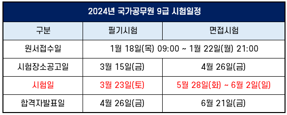 | 9급 국가직 | 2024.1.18(목) ~ 1.22.(월) | 2024.3.23(토) |