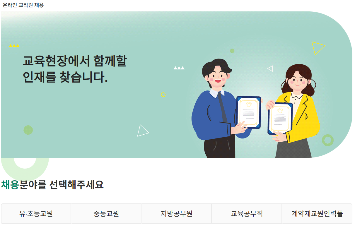 지방교육청 9급 교육행정직은 원서접수 첫날 오전 9시부터 마지막 날 오후 6시까지 5일 동안 온라인 교직원 채용 사이트에서 원서접수를 진행합니다. 2023년에 교육청 공무원 채용 사이트가 개편되어 아래와 같이 온라인 교직원 채용 사이트에서 지방공무원 탭을 클릭하면 시험 공고 등도 볼 수 있습니다.