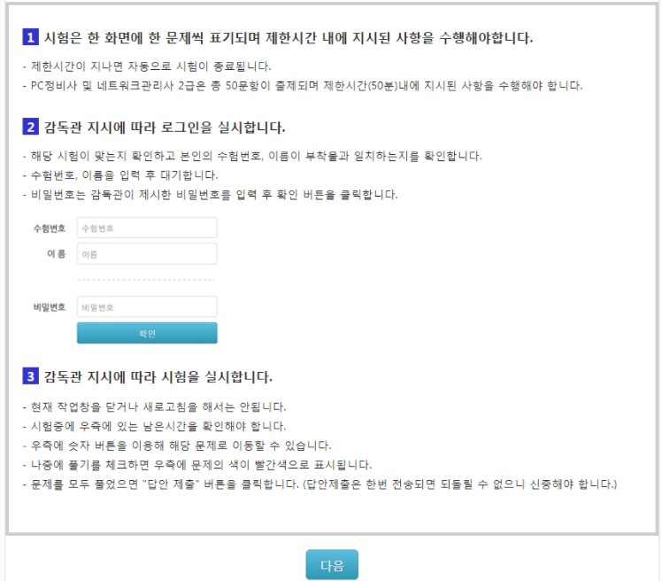 네트워크관리사 2급 필기시험은 종이 시험지가 아닌 온라인 방식으로 컴퓨터 PC 화면에 표시된 시험문제를 푸는 CBT 시험입니다. 화면에 표시된 문제의 답안을 클릭하는 방식으로 문제를 풀지만, 시험장에서 지급되는 손바닥 크기의 메모지에 계산이 가능합니다.