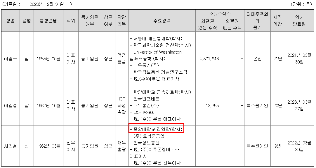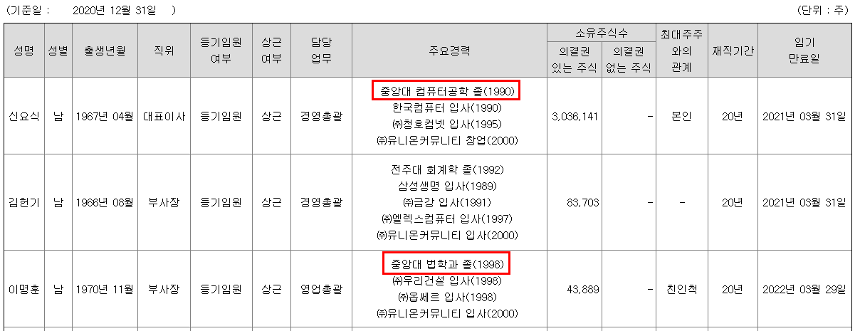 이유: 신요식 대표이사가 이재명 지사와 중앙대 동문, 이명훈 부사장이 이재명 지사와 중앙대 법대 동문