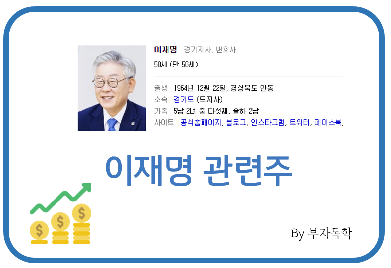 이재명 경기도지사가 차기 대통령이 될 경우 수혜가 예상되는 이재명 관련주는 이재명 지사의 고향인 경북 안동과 관련된 회사이거나 전 성남시장으로 근무했던 이력으로 인해 성남과 관련된 회사입니다.