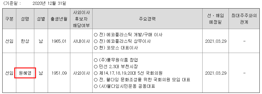 이유: 이재명 최측근으로 알려진 원혜영 전 국회의원을 사외이사로 선임