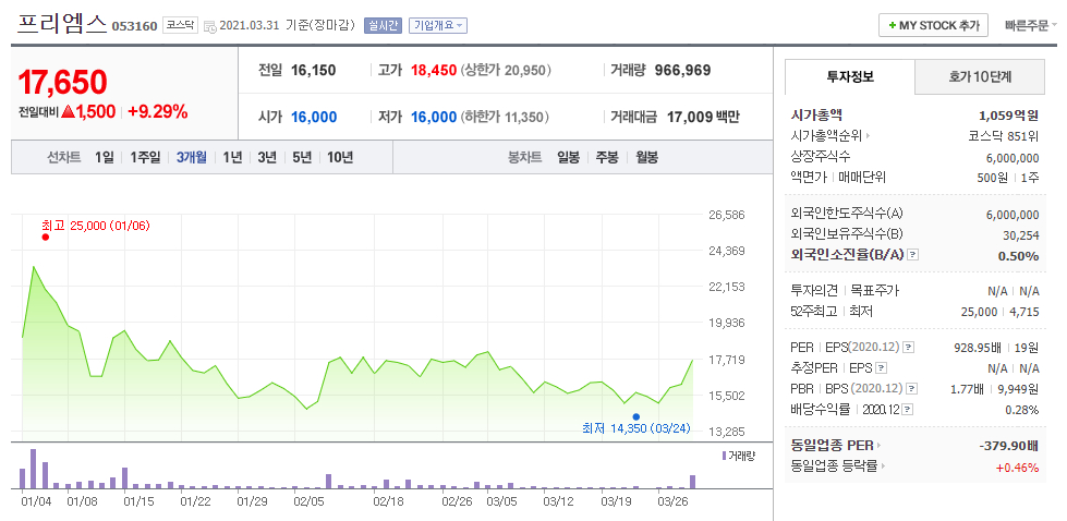10. 프리엠스 (053160 코스닥)