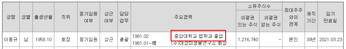 이유: 최대주주인 이동규 회장과 이재명 지사가 중앙대 법학과 동문