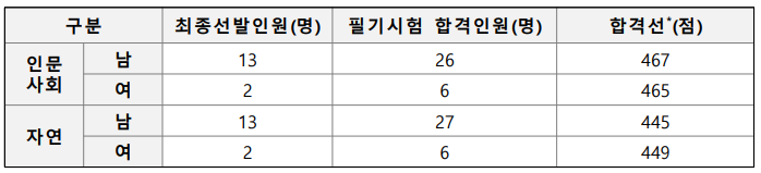 2021년 합격선이 456점이었던 인문사회계열 남자는 2022년 합격선이 467점으로 11점이 상승했고, 인문사회계열 여자는 합격선이 2021년 462점에서 2022년 465점으로 3점 상승했습니다.