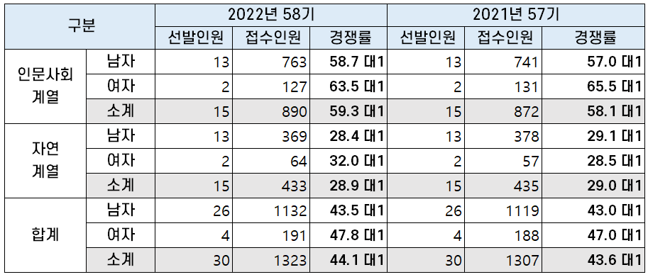 원서 접수 결과 총 30명을 선발하는데 1,323명이 지원해 경쟁률은 44.1대 1을 기록해 2021년 43.6대 1의 경쟁률보다 소폭 증가했습니다.