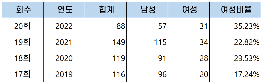 | 회수 | 연도 | 합계 | 남성 | 여성 | 여성비율 |