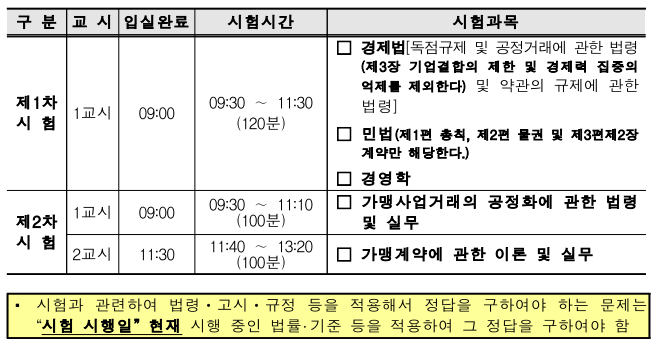 가맹거래사 2차 시험 과목은 '가맹사업거래의 공정화에 관한 법령 및 실무'와 '가맹계약에 관한 이론 및 실무' 2과목이고, 과목 당 시험 시간은 100분입니다.