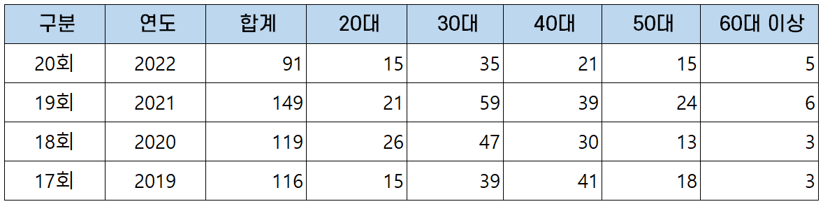 2022년 91명의 합격자 중 35명이 30대, 21명이 40대, 15명이 50대, 15명이 20대였으며, 60대 이상 합격자도5명이나 있었습니다.
