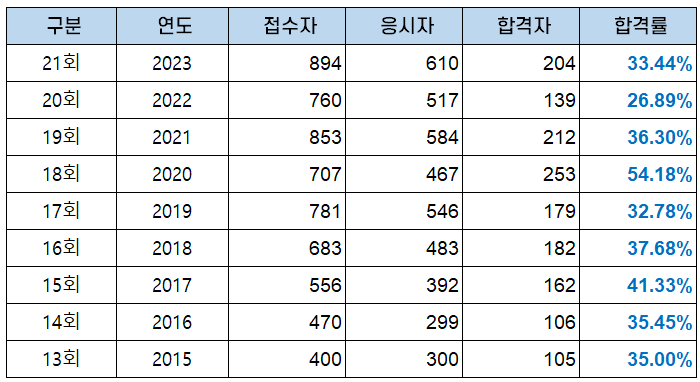 | 구분 | 연도 | 접수자 | 응시자 | 합격자 | 합격률 |