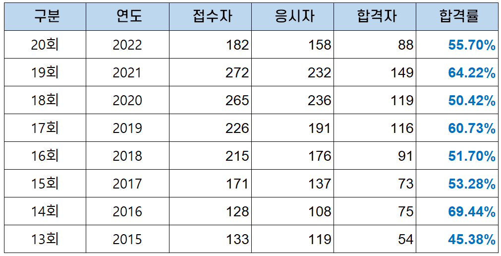 2022년에는 760명의 응시자 중 139명이 합격해 합격률은 26.89%를 기록했는데요. 최근 시행된 시험 중 가장 낮은 합격률을 보였습니다.