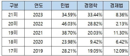 2022년에는 민법의 과락률이 34.59%로 하락한 반면, 경영학이 어렵게 출제되며 과락률이 33.44%로 상승했습니다.