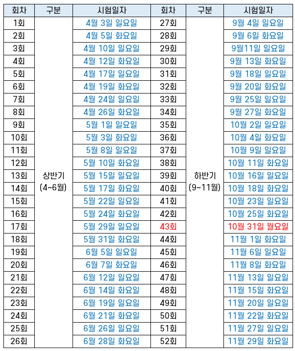 | 회차 | 시험일자 | 회차 | 시험일자 |