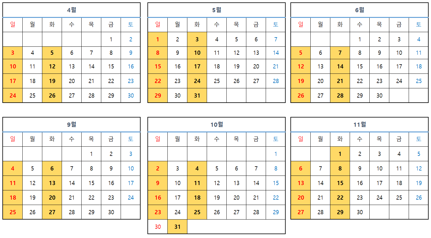 | 상반기(4~6월) | 하반기(9~11월) | ||