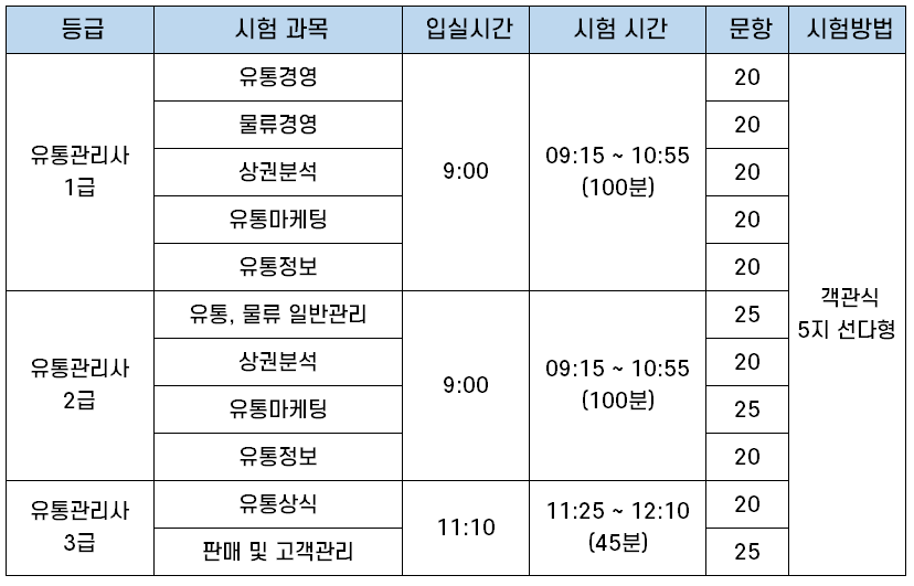 | 2급 | 유통, 물류 일반관리 | 9:00 | 09:15 ~ 10:55 (100분) |