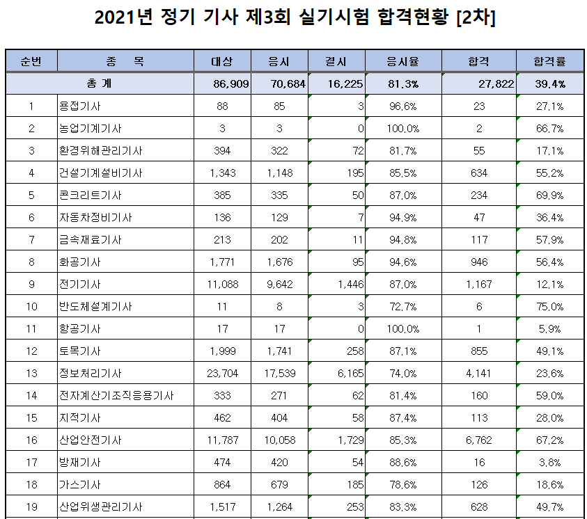2021년 제3회 정기 기사 실기시험이 시행된 41개 종목의 평균 합격률은 39.4%입니다.