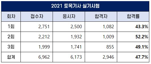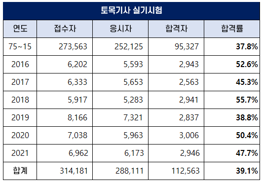 1~3회 시험을 합한 2021년 토목기사 실기시험 합격률은 47.7%를 기록해 역대 토목기사 실기시험 평균 합격률은 39.1%보다 높았습니다.