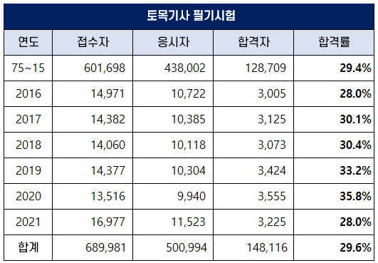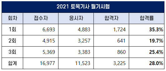 1~3회 시험을 합한 2021년 토목기사 필기 합격률은 28%를 기록했는데요. 역대 토목기사 필기시험 합격률 29.6%와 큰 차이는 없습니다.