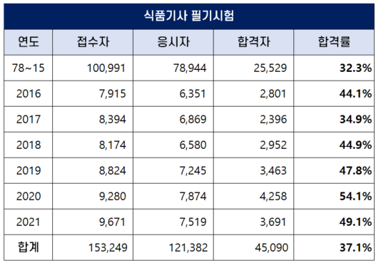 1~3회 필기시험을 합한 2021년 식품기사 필기 합격률은 49.1%를 기록하며 지난 2020년 합격률인 54.1%보다는 낮아졌지만 역대 평균 합격률인 37.1%보다는 높았습니다.