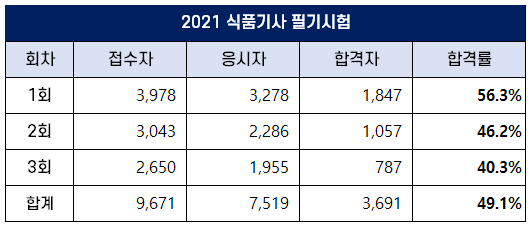 2021년 식품기사 1회 필기 시험 합격률은 56.3%, 2회 필기는 46.2%, 3회 필기는 40.3% 합격률을 기록했습니다.