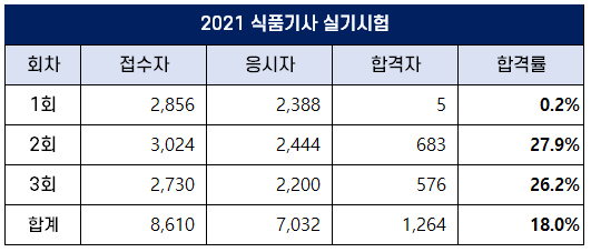 1~3회 실기시험을 합한 2021년 식품기사 실기 합격률은 18%를 기록해 지난해 2020년 실기 합격률인 11%보다는 높아졌는데요.