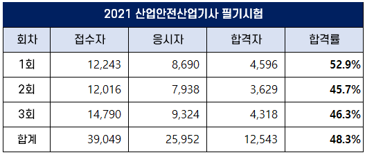 1~3회 필기시험을 합친 2021년 산업안전산업기사 필기 합격률은 48.3%였는데요. 2020년 합격률인 51.3%보다는 낮았지만, 역대 평균 합격률 31.8%보다 높았습니다.