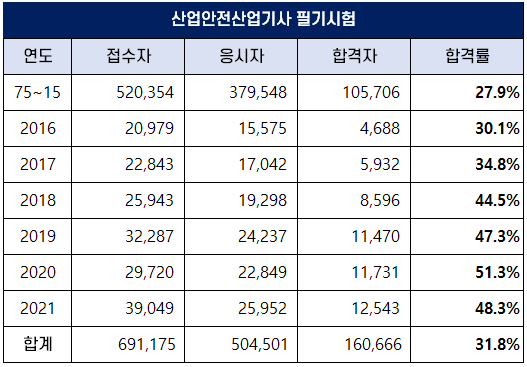 2022년 산업안전산업기사를 준비하는 수험생을 위해 2021년 필기와 실기 합격률 및 역대 합격률을 정리했습니다.