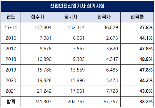 2021년 산업안전산업기사 1~3회 평균 실기 합격률은 43%를 기록하며 역대 산업안전산업기사 평균 합격률인 33.2%보다 높은 합격률을 기록했습니다.