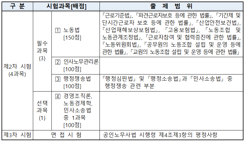 - 필수과목(3과목): 노동법, 인사노무관리론, 행정쟁송법