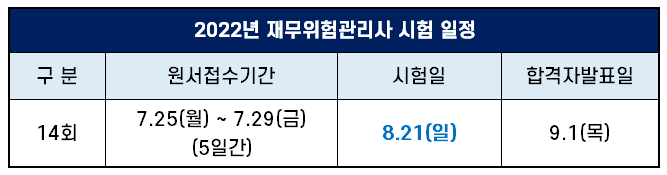 국내 FRM 시험은 매년 1회, 통상 8월에 시행하는데요. 2022년에도 제14회 재무위험관리사 자격시험을 8월 21일 일요일에 서울, 부산, 광주에서 시험을 실시합니다.