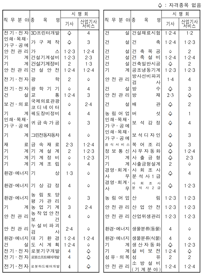 종목별 응시 수요 및 산업동향 등을 고려 연평균 필기시험 응시인원이 50명 미만인 종목의 필기시험은 격년제로 시행하는데요. 2022년 필기시험을 시행하지 않고 2023년에 필기시험 시행 예정인 기사 자격 종목은 8 종목입니다.