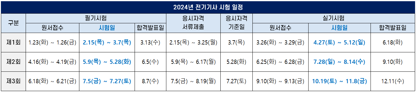 2024년에도 예년과 마찬가지로 전기기사 필기시험과 실기시험은 정기 기사 1회, 2회, 3회 차에 시험이 시행됩니다.