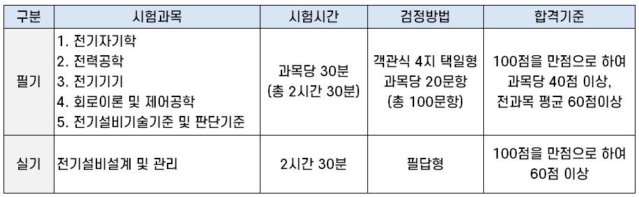 | 필기 | 1. 전기자기학 2.전력공학 3.전기기기 4.회로이론및제어공학 5.전기설비기술기준및판단기준 |