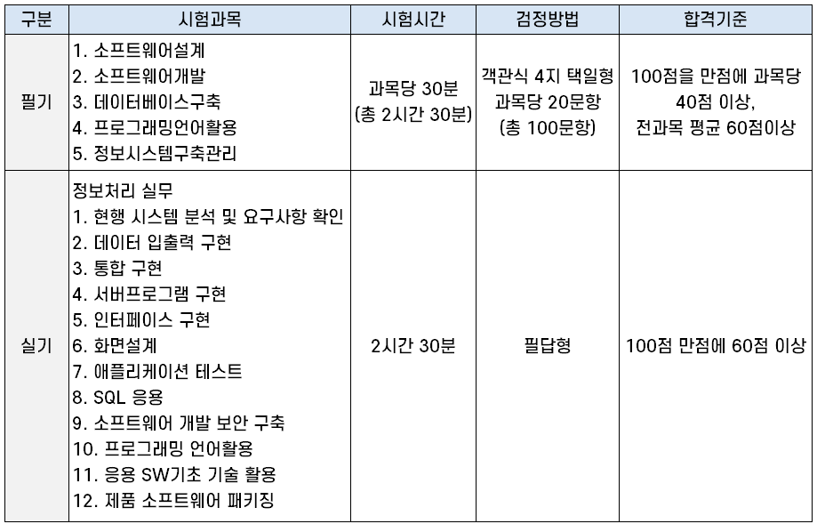 | 실기 | 정보처리 실무 1.현행시스템분석및요구사항확인 2.데이터입출력구현 3.통합구현 4.서버프로그램구현 5.인터페이스구현 6.화면설계 7.애플리케이션테스트 8.SQL응용 9.소프트웨어개발보안구축 10.프로그래밍언어활용 11.응용SW기초기술활용 12.제품소프트웨어패키징 |