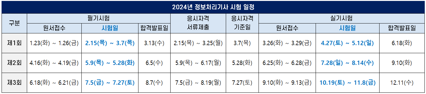 예년과 마찬가지로 2024년에도 정보처리기사는 정기 기사 시험 1회, 2회, 3회 차에 필기시험과 실기시험이 시행되는데요. 시험 회차별 시험일과 원서접수기간 및 합격자 발표일은 다음과 같습니다.