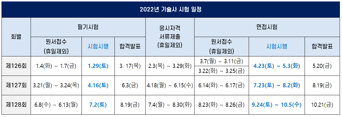 한국산업인력공단이 2022년 기술사 시험 일정 및 시행계획을 공고했습니다. 2022년에도 기술사 자격시험은 총 3번의 필기시험과 면접시험이 시행됩니다.
