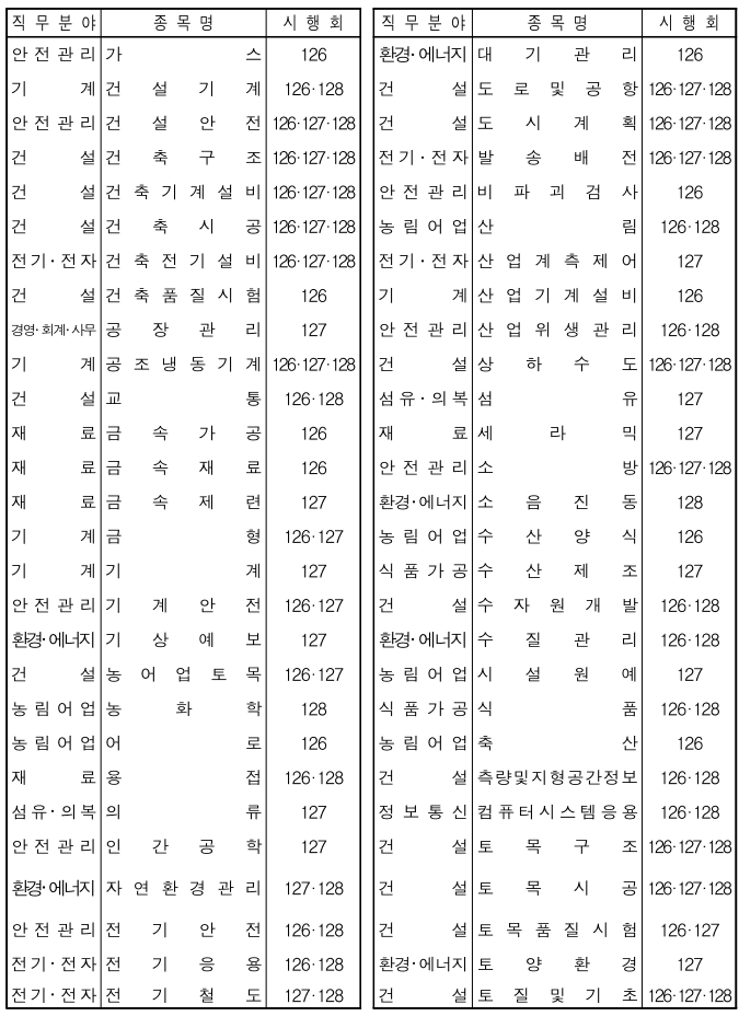 - 안전관리: 가스기술사, 기계안전기술사, 전기안전기술사, 비파괴검사기술사, 소방기술사, 화공안전기술사 - 기계: 건설기계기술사, 공조냉동기계기술사, 금형기술사, 산업기계설비기술사, 차량기술사 - 안전관리: 건설안전기술사, 산업위생관리기술사 - 건설: 건축구조기술사, 건축기계설비기술사, 건축시공기술사, 건축품질시험기술사, 교통기술사, 농어업토목기술사, 도로및공항기술사, 도시계획기술사, 상하수도기술사, 수자원개발기술사, 측량및지형공간정보기술사, 토목구조기술사, 토목시공기술사, 토목품질시험기술사, 토질및기초기술사, 조경기술사, 지적기술사, 지질및지반기술사, 철도기술사, 항만및해안기술사, 해양기술사 - 전기·전자: 건축전기설비기술사, 전기응용기술사, 발송배전기술사, 전자응용기술사, 철도신호기술사 - 경영·회계·사무: 포장기술사 - 재료: 금속가공기술사, 금속재료기술사, 용접기술사, 표면처리기술사 - 환경·에너지: 대기관리기술사, 수질관리기술사 - 농림어업: 어로기술사, 산림기술사, 수산양식기술사, 축산기술사, 종자기술사 - 식품가공: 식품기술사 - 정보통신: 컴퓨터시스템응용기술사, 정보관리기술사 |
